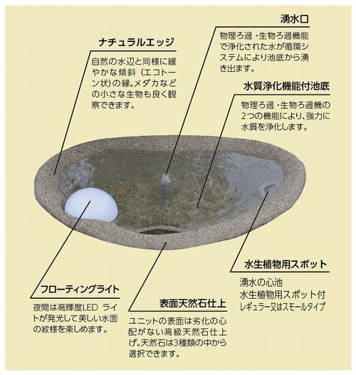 ナチュラルな曲線でデザインした成型池(天然石仕上げ)の底から湧き出る水に満たされると心(ハート)をモチーフにした水面形が現れる「湧水の心池」。美しいビオトープ作りに必要な全てのアイテム(オリジナル成形池、水質浄化システム、水循環ポンプ、水位調整機能、フローティングライト等)を集約し、清らかな水質を維持するために最適に状態にユニット化したビオトープシステムです。