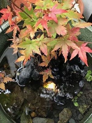ミニ滝を購入した「K」と申します。おかげさまで、思い描いていたとおりの小さな水辺を日常に取り入れることができました。仕事に行く前、帰宅してから、しばし鉢のなかをのぞきこむのが日課です。 鉢には、ホトケドジョウ3匹と青 メダカ5匹が泳いでいます。苔対策のため、石巻貝もいれています。ご推奨のシノブ、モミジを植栽スポットに植えたらとてもよく育ちました。ポンプの掃除はひと月毎、餌を与えているので、水替えは4分の一くらいずつ、1週間に一度か二度しています。