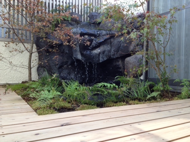 長谷川様邸は、住友林業さんが手掛ける「新築そっくりさん」というリフオームを施され、その中に作られた二階のバルコニーに滝と池を作られました。その名の通り、本当に新築の建物と見間違えるほど美しい出来栄えでしたので、それに相応しいビオトープをお作りさせていただきました。長谷川様は大変穏やかで優しい方で、高齢のお父様をとても大切にされているようにお見受けしました。私の勝手な想像ですが、お父様は植木を集めるのが大好きとのことでしたが、足が不自由なようでしたので、外出しなくてもテラスで植木いじりをできるようにとの思いでこのようなお庭を作られたのかなと思いました。完成後、お父様にも大変喜んでいただき、私もほっとしました。これからも末永くお父様と一緒に楽しまれてください。ありがとうございました。