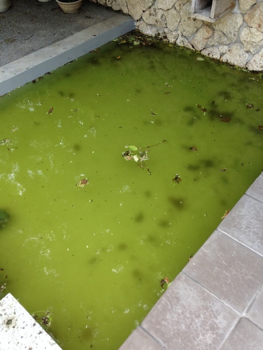 まだ完成して間もないコンクリート製の池でしたが、夏になるとアオコが発生し、頻繁に掃除してもすぐに水が汚れてしまい、臭いにも悩まされているとのことでした。現場を調査したところ、水は循環されているのですが濾過システムがついておらず、水漏れも発生していました。そこでアクアフォレスト式濾過システムを設置し、防水をし直したところ、アオコの発生と水漏れはピタリと止まり、今は快適に綺麗な池を楽しんでいらっしゃるとのことです。